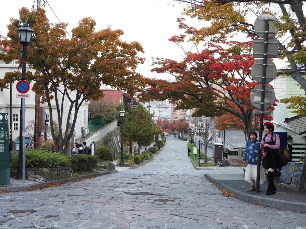 下山後は市街地へ向かって歩き、函館の街並みを散策しました。函館は坂の多い街で、大三坂や二十間坂などの坂道が特徴的です。坂の途中から海が見える場所も多く、港町らしい景観が広がります。